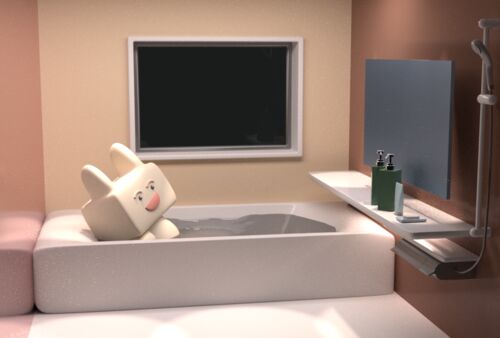 バスルームをモデリングしてみた こちらはお風呂の中からレンダリングした画像です。こんな良いバスルームのある部屋に住んでみたいです。 ドア外からもレンダリングしてみました、今更ですがお風呂のドアがガラス張りなのはちょっと良くなかったかもしれま…